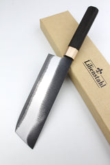 The pith rays of the thousand-year-old bog oak shine through the handle of the Nakiri.