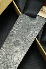 This pattern was forged with light and dark stars in an exploded mosaic damask consisting of 3 different mosaic bars, which in turn are assembled from 4 different steels with the greatest precision.