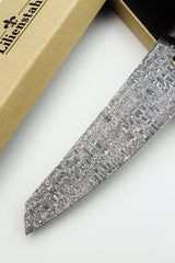 This Lilienstahl Gyuto is forged out of soundwave-pattern Damascus-steel and finished with a snakewood handle.